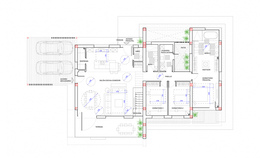 Algunas características: Electricidad de la red general, agua de regadío económica potabilizada in situ con depósito de 1000 litros, calefacción y refrigeración por suelo radiante en toda la casa (aerotermia), preinstalación de aire acondicionado, ventanas y puertas de doble cristal con protección solar, carpintería interior hecha a medida, iluminación LED directa e indirecta, sistema de domótica para estores y videoportero, encimera de cocina hecha con resina altamente resistente…