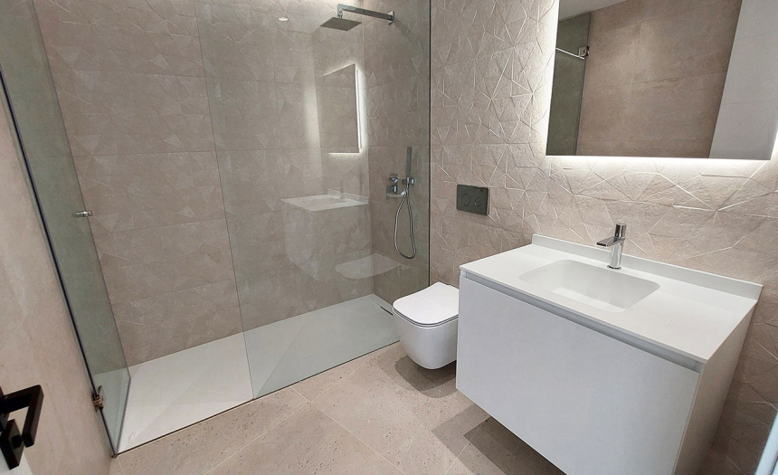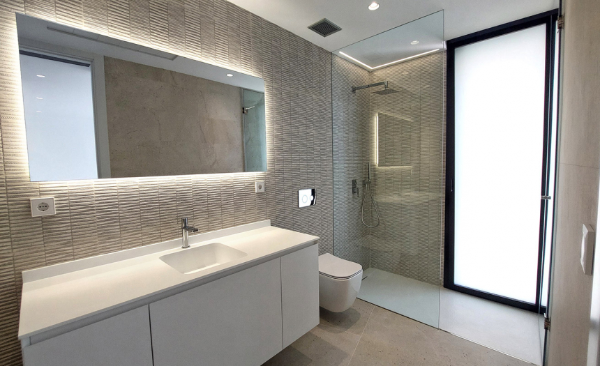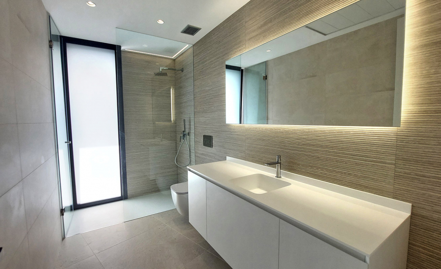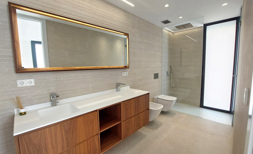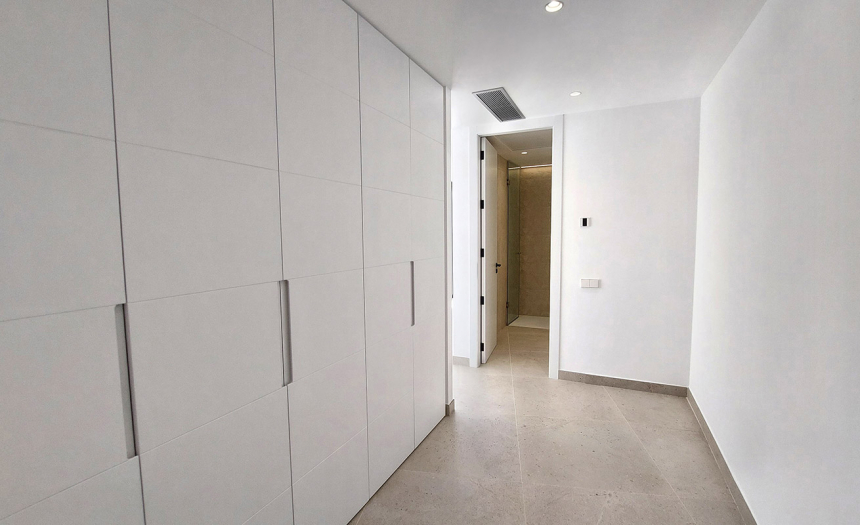 Descendiendo a la planta 2, por las escaleras o por el ascensor, llegamos a la zona de los dormitorios, que, en este nivel, son concretamente tres, todos ellos con cuarto de baño en suite, armarios empotrados y salida a una generosa terraza con preciosas vistas al mar. El dormitorio principal dispone, además, de un espacioso y práctico vestidor completamente amueblado.