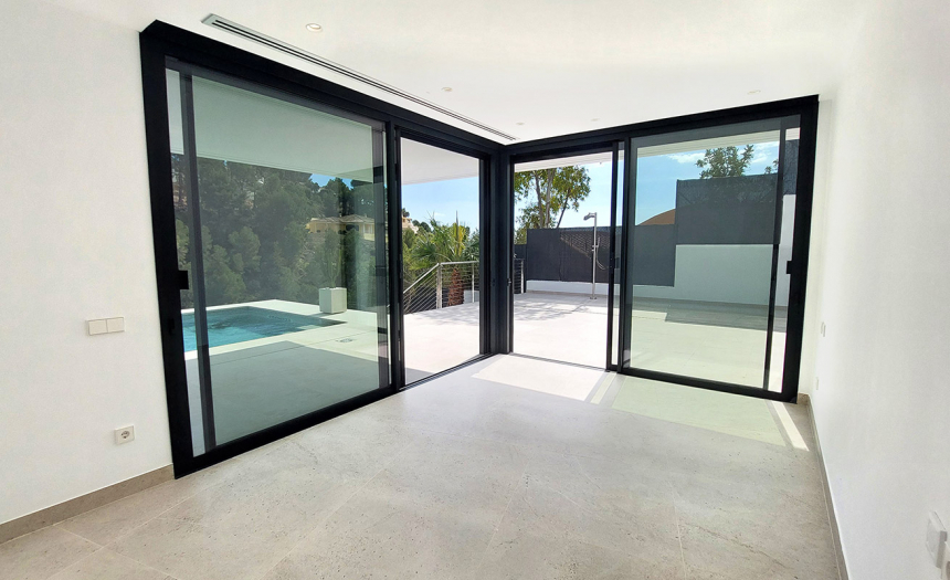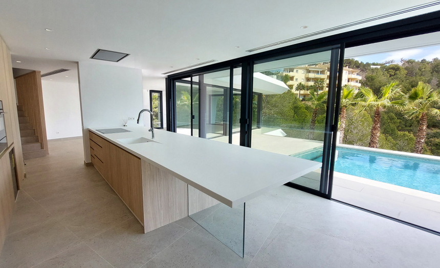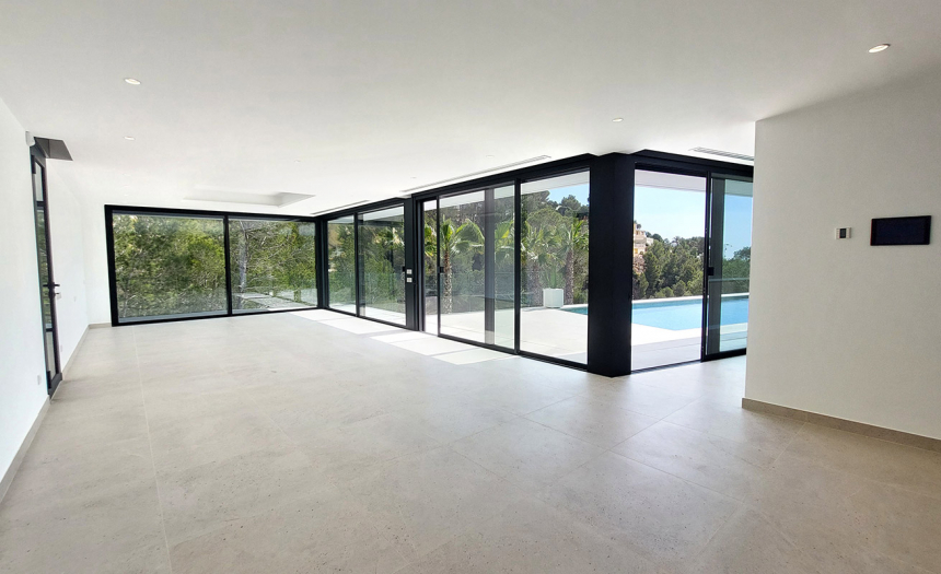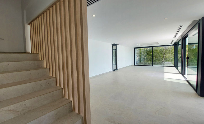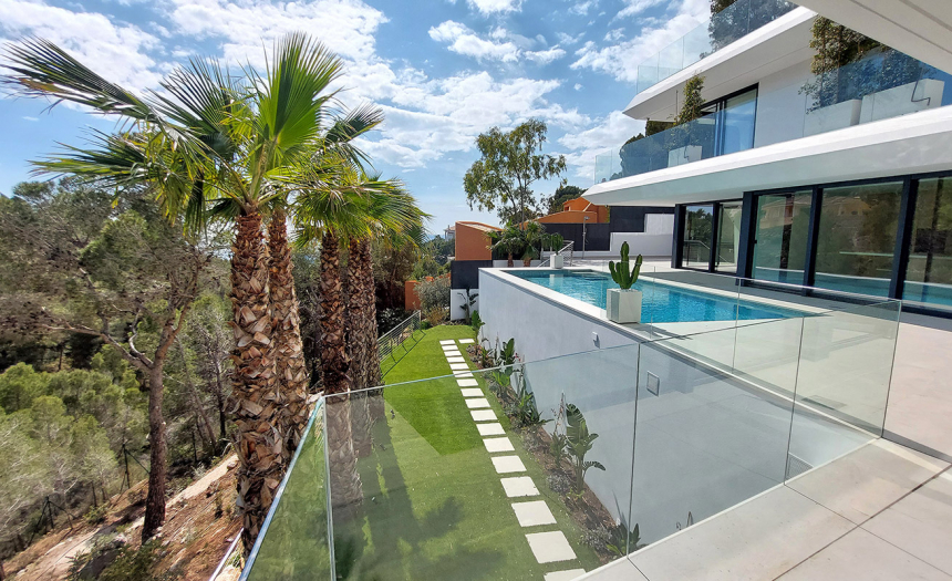 Se trata de una villa de estilo moderno y minimalista, con grandes ventanales y puertas correderas, que permiten una constante conexión entre el interior y exterior. Sus 510m2 de superficie construida se distribuyen en tres plantas + sótano, conectadas mediante escaleras internas y ascensor. El terreno donde se asienta la casa tiene una superficie total de 1.383m2 y está completamente vallado.
