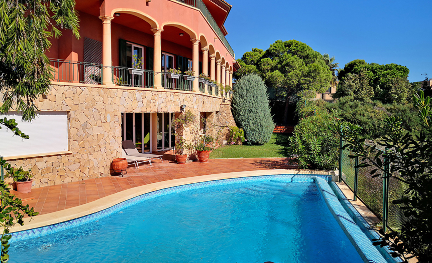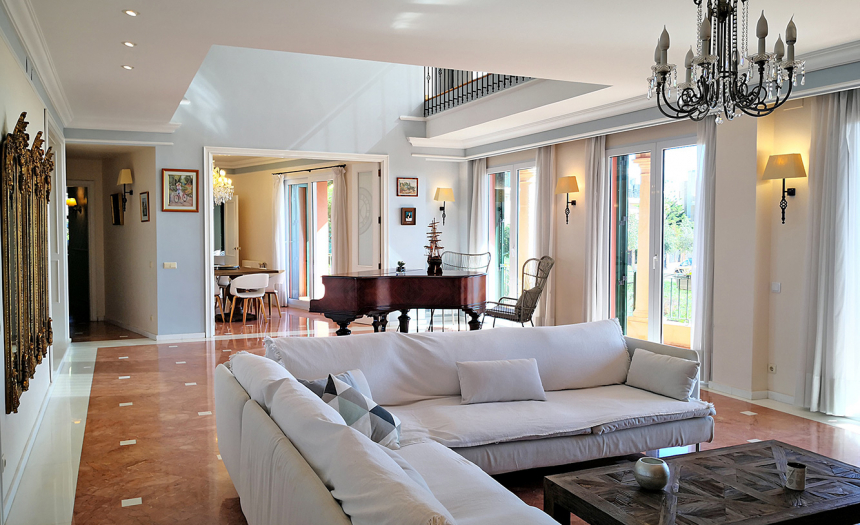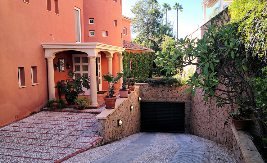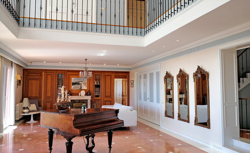 El chalet cuenta con 655m2 de superficie útil, distribuidos en cuatro plantas con ascensor. En la planta principal (a la altura de la calle), encontramos la cocina (con lavandería, almacén y espacio para desayunar), un aseo para invitados, el coqueto comedor (con su amplia mesa de madera maciza), el gran salón (con techos altos, chimenea y grandes ventanales), la sala de televisión, el hall de entrada, una gran terraza (con impresionantes vistas) y el dormitorio principal (con espectaculares vistas al mar, acceso directo a la piscina, vestidor y cuarto de baño en suite con bañera de hidromasaje). En la primera planta, hay tres dormitorios (todos ellos con armario empotrado o vestidor), sus respectivos cuartos de baño en suite, un saloncito y otra gran terraza. En la segunda planta, también conocida como «Torreón», hay un enorme dormitorio, un pequeño cuarto de ducha en suite, un vestidor y otra gran terraza con las mejores vistas de toda la casa. Y por último, en la planta sotáno, existen dos dormitorios más, dos cuartos de baño, un amplio salón de verano que comunica con la piscina, una cocina de verano, un salón de juegos, una bodega (amueblada, con mesa y sillas de madera maciza, botelleros y toneles para vino) y el parking subterráneo con capacidad para tres coches.