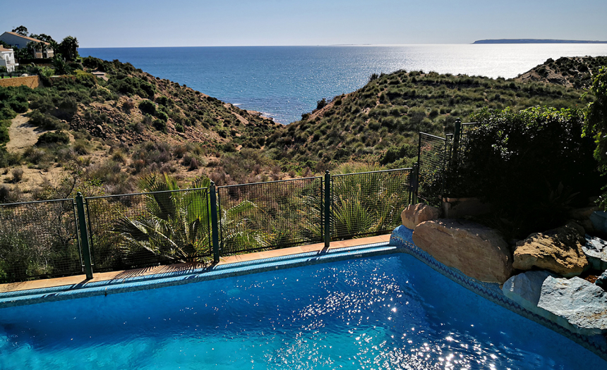 Impresionante mansión de estilo mediterráneo-provenzal con vistas al mar y a cala Cantalar. La casa fue construida en 1997 con las mejores calidades y se asienta en una zona muy tranquila y privilegiada del Cabo de las Huertas (Alicante), en primera línea, sin posibilidad de que construyan delante de ella.