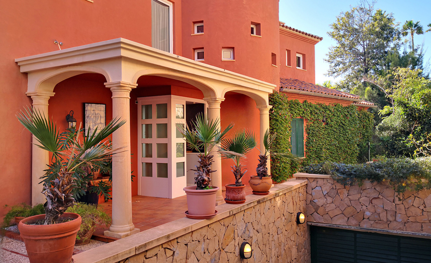 La parcela tiene una superficie de 1200m2 y dispone de varios jardines con suelos de césped, piedra, grava y pavimento, con una vegetación frondosa a base de palmeras, pinos, olivos, granados, higueras, bugambilias, abetos y otras plantas decorativas. La piscina con vistas al mar y orientada al sur, al igual que el resto de la vivienda, disfruta de sol durante todo el año, alargando así la temporada de baño.